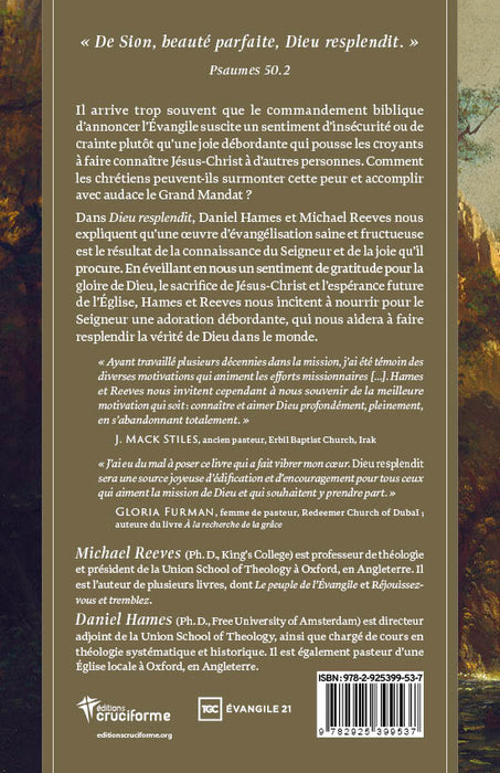 «L’Église en Occident connaît un ralentissement dans l’évangélisation à un moment où le besoin n’a jamais été aussi grand – où les opportunités n’ont jamais été aussi éclatantes – pour elle d’apporter au monde la bonne nouvelle de Jésus-Christ. Dans Dieu resplendit, Daniel Hames et Michael Reeves nous amènent au cœur de ce qui constitue la véritable motivation biblique pour annoncer la bonne nouvelle de Christ: une vision appropriée de notre grand Dieu de gloire. Plus nous serons remplis de l’amour glorieux de Dieu, plus nous serons portés à parler de l’Évangile autour de nous.»